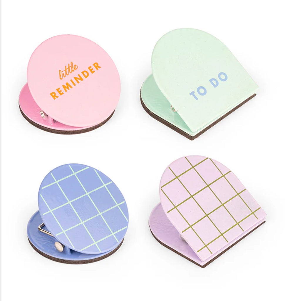 Bellissimo set dai colori tenui e le grafiche retrò, di 4 clip magnetiche in metallo, che potrai attaccare al frigo o a qualsiasi parte dove vorrai tenere a portata di mano, biglietti con gli appunti o perché no foto o ritagli di ricordi.