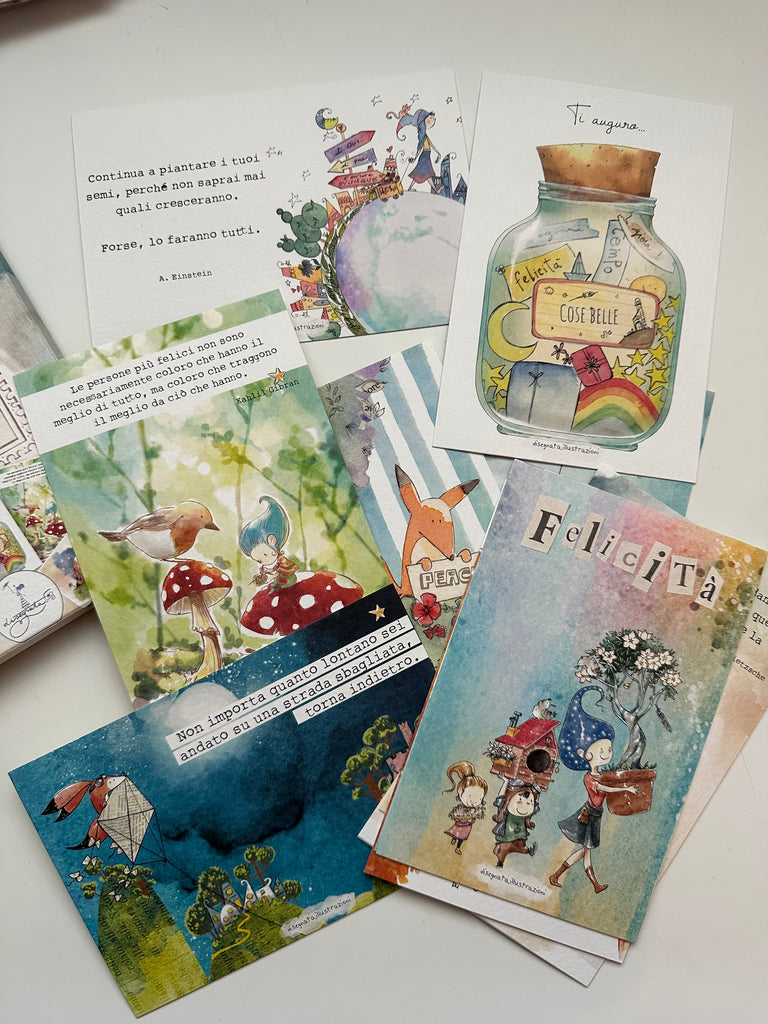Set di 12 cartoline per stupire chi ami. All’interno della confezione, troverai 12 bellissime cartoline, illustrate da Disegnata Illustrazioni, tutte affrancabili e spendibili. Potrai utilizzarle come biglietto o incorniciarle perché sono davvero poetiche.